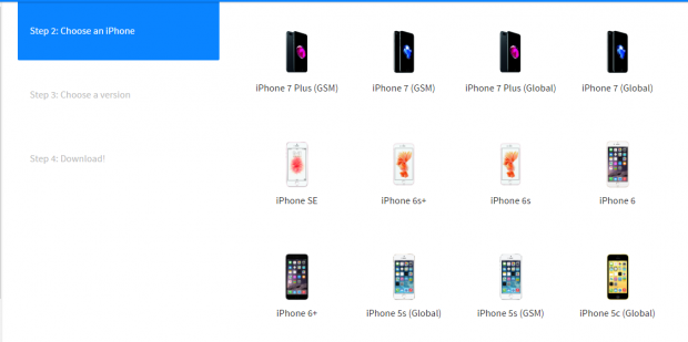 Để tải file IPSW của iPhone, bạn vào đây. Tại giao diện chính hãy chọn đúng thiết bị mà bạn đang sử dụng (Nhớ lưu ý đừng để nhầm lẫn giữa phiên bản Lock và Quốc tế).