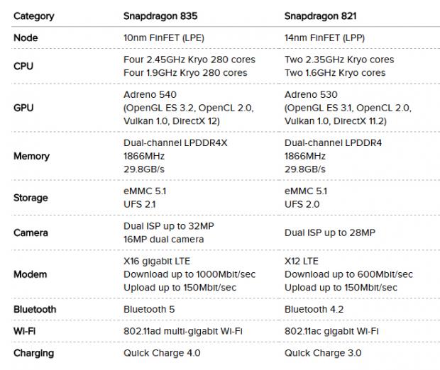 Dưới đây là bảng so sánh tổng quan về những thông số cơ bản giữa Snapdragon 835 và người tiền nhiệm gần nhất 821. Mời các bạn xem qua: