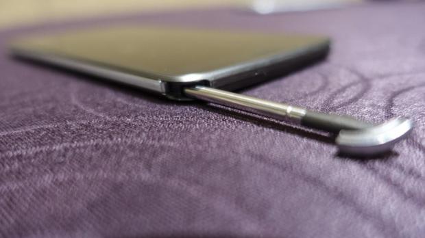 Mặt trên gồm cảm biến, loa và camera trước 8 MP. Ở đỉnh góc phải là nơi để rút chiếc bút Stylus ra.