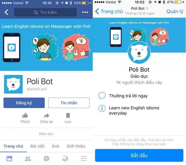 Để bắt đầu học, tại thanh tìm kiếm của Facebook hoặc Messenger, hãy tìm một trang fanpage mang tên Poli Bot, hoặc bạn cũng có thể truy cập trực tiếp vào trang tại đây.