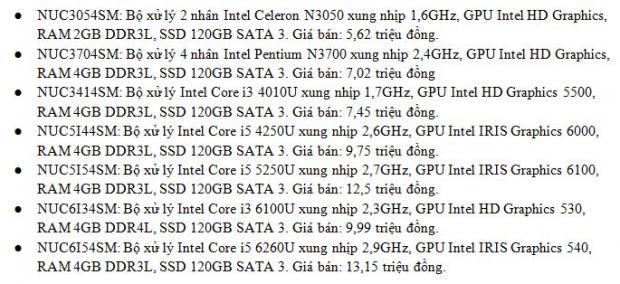 Thông tin giá của ROSA Intel NUC theo từng cấu hình cụ thể (nguồn: Intel)