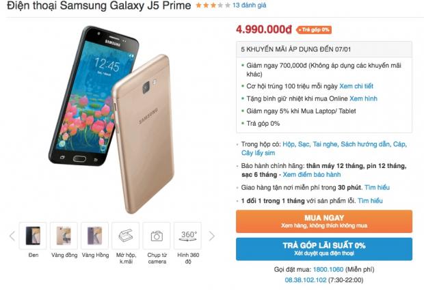Cụ thể khi mua Galaxy J5 Prime tại Thế giới di động trong hôm nay bạn sẽ được giảm giá ngay 700 ngàn đồng, tức giá bán từ 4.99 triệu giảm xuống còn 4.29 triệu. Lưu ý là chương trình giảm giá chỉ áp dụng trong 1 ngày duy nhất (7/1) nên nếu muốn tậu smartphone mới trong dịp tết này thì hãy nhanh chân lên nhé.