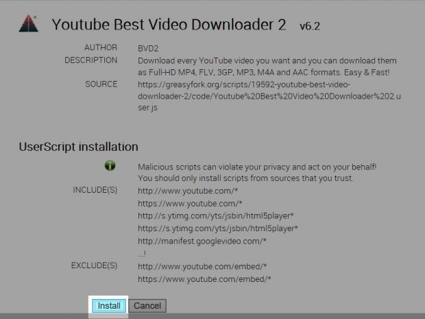 - Trên màn hình sẽ hiện ra danh sách các script có sẵn bao gồm chức năng của từng cái. Ở đây, mình chọn vào Youtube Best Video Downloader 2.
