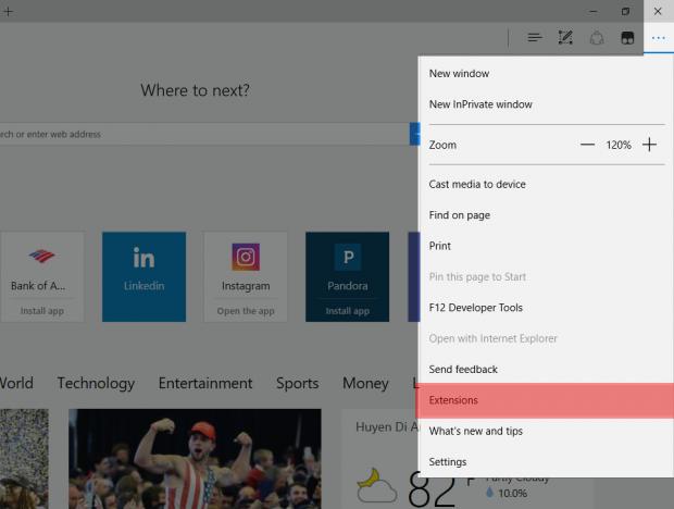 - Người dùng mở trình duyệt Edge và nhấn vào biểu tượng dấu 3 chấm, chọn Extensions.