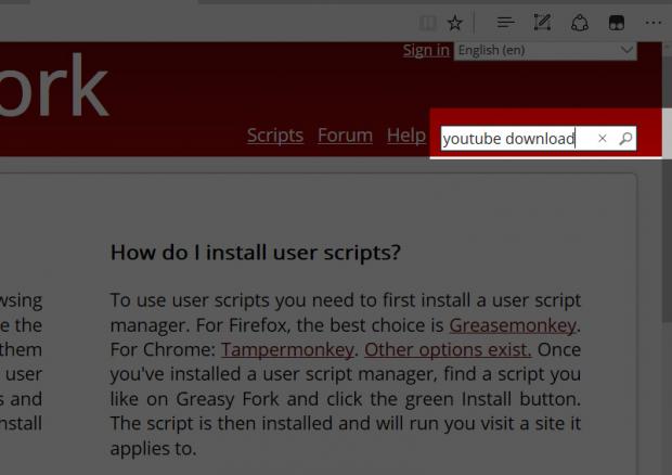 - Lúc này tab GreasyFork sẽ hiển ra, bạn nhập từ khóa Youtube download vào rồi nhấn Enter.