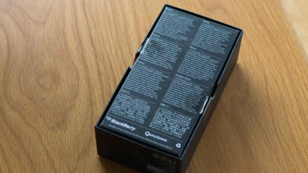 Ở đây chúng ta sẽ có một chiếc hộp màu đen theo như truyền thống của BlackBerry. Ở vỏ hộp là tên máy, logo thương hiệu BlackBerry, nguồn gốc xuất xứ, ở mặt sau là một số lưu ý cũng như đặc điểm của sản phẩm được nhà sản xuất in theo nhiều thứ tiếng khác nhau.