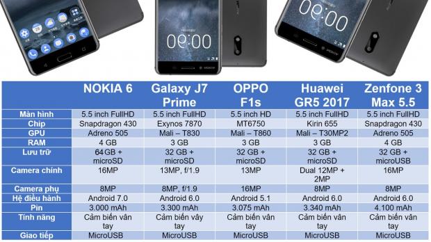 Dưới đây là bảng so sánh nhanh cấu hình của các sản phẩm tầm trung chính hãng cùng Nokia 6, có thể thấy sự ra mắt của ông vua huyền thoại khiến tín đồ công nghệ sôi động hơn bao giờ hết.