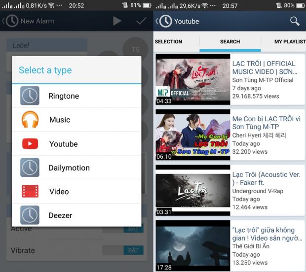 Khi đó một bảng hiện ra và bạn Youtube để cài đặt video trên đây là báo thức cho mình. Tiếp theo bạn nhấn vào mục Search và tìm clip mình muốn và nhấn vào.