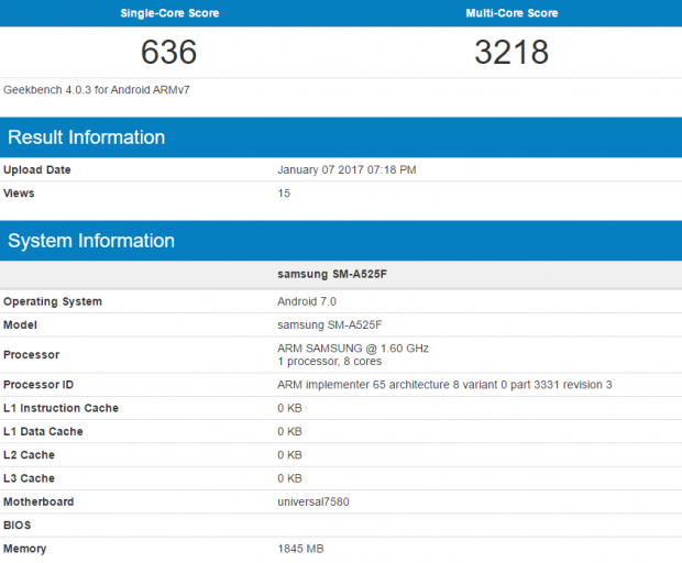 Có một điểm thú vị ở đây, trên Geekbench model thử nghiệm là SM-A525F cho thấy nó là biến thể của Galaxy A5 2017 nhưng các thông số kỹ thuật bên trong máy là của Galaxy A5 2016.
