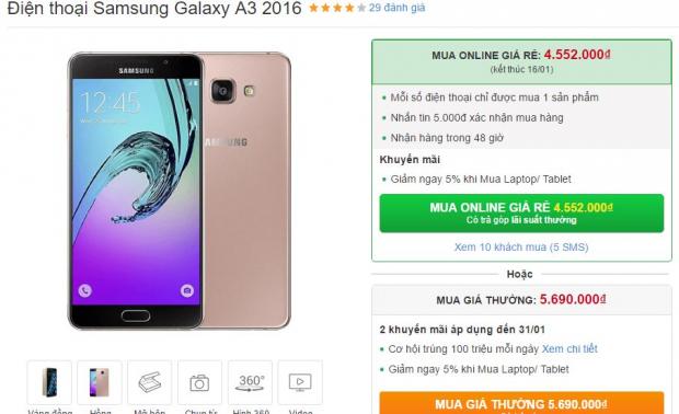 Theo đó, từ bây giờ đến ngày 16/1, khi bạn mua online mẫu smartphone Galaxy A3 2016 thì mức giá sẽ được giảm từ 5.69 triệu đồng xuống chỉ còn 4.55 triệu mà thôi, giảm hơn 1 triệu đồng, mức giảm mạnh nhất từ trước tới nay đối với mẫu smartphone này.