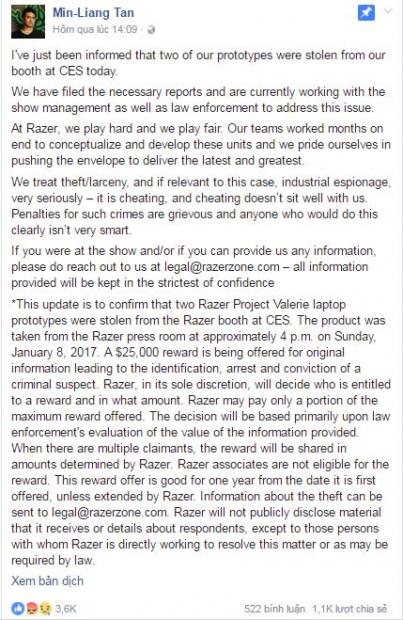 Vị này cũng không loại trừ khả năng đây là do gián điệp công nghiệp, một hành vi chơi xấu từ đối thủ. Theo Gizmochina, trong phần nội dung update trên trang Facebook của mình, CEO của Razer cũng đã tuyên bố treo thưởng 25.000 USD cho ai cung cấp tin tức để giúp họ tìm ra thủ phạm, mọi thông tin có thể gửi về legal@razerzone.com trong thời hạn 1 năm.