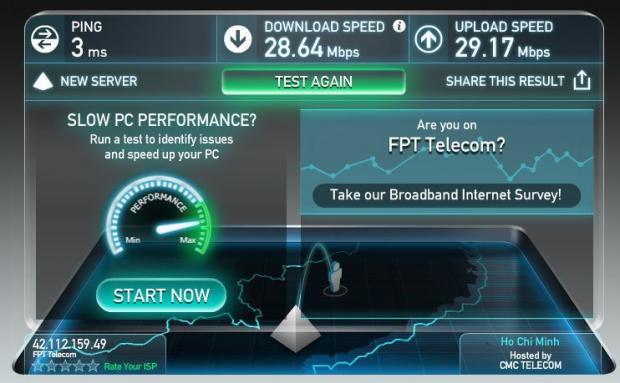 Trong bài test tốc độ mạng, mình thấy mạng vẫn lúc mạnh, lúc chưa được mạnh lắm nhưng với tốc độ download trên 30 Mbps, upload trên 20 Mbps thì nó đã gần ngang với tốc độ gói cáp quang của nhà mình đang dùng.