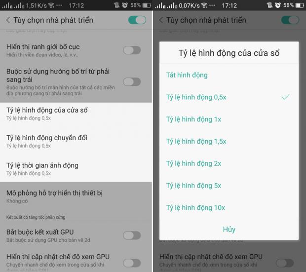 Người dùng có thể tăng tốc độ ảnh động trên thiết bị của mình để làm cho máy trở nên mượt hơn bằng cách truy cập vào Cài đặt > Tuỳ chọn nhà phát triển. Tại đây, mọi người có thể chuyển Tỉ lệ hình động từ 1x xuống còn 0.5x hoặc tắt, để giải quyết tình trạng chậm chạp cho smartphone.