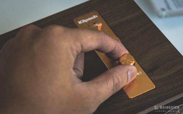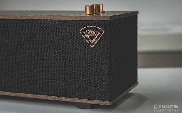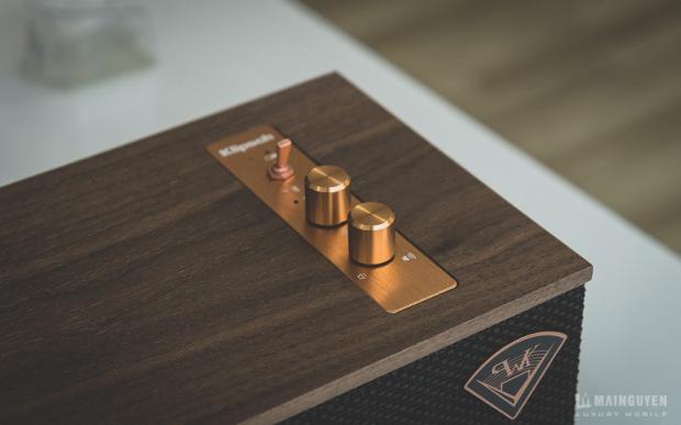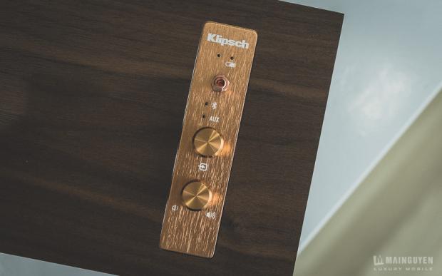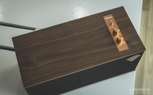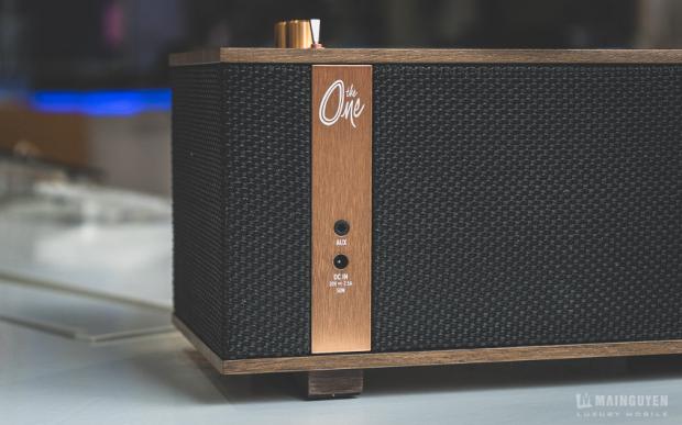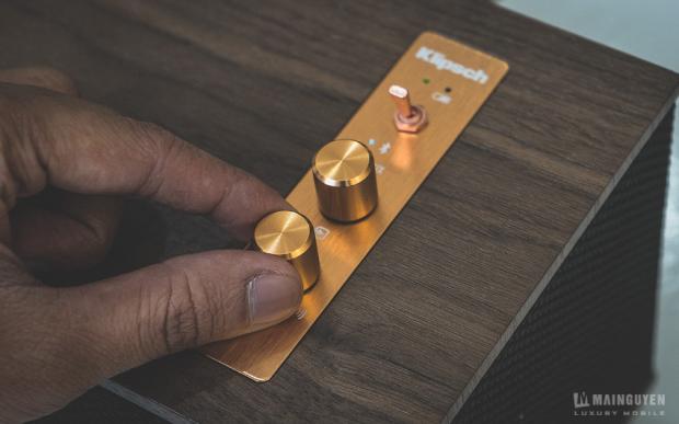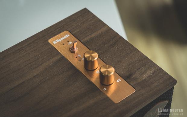 Ngay từ cái nhìn đầu tiên, nếu bạn như là một người yêu thích sự tinh tế, sang trọng, cổ điển thì ắt hẳn bạn phải thích The One rất nhiều, từ cách phối màu vàng, hồng vàng và đen với nhau cho đến ngôn ngữ thiết kế của nó. Ở trên, để gia trăng phần sang trọng, Klipsch đã dùng một lớp gỗ phủ toàn bộ bề mặt bên trên, các núm điều chỉnh được làm bằng kim loại mạ vàng ánh lên bắt mắt. Kèm theo đó, phần màng loa màu đen là sự kết hợp giữ vài và polyme giúp chống nước mà lại không kém phần chắc chắn.