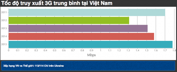 Nhìn vào bảng số liệu ngay bên dưới, các bạn có thể thấy rằng, tốc độ truy xuất 3G trung bình của Việt Nam tính đến hết năm 2015 không vượt qua được con số 1.8 Mbps.