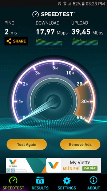 Còn mạng 4G của Viettel do bạn Hữu Tình đo được tại Biên Hoà thì có tốc độ download tới 38.54 Mbps và upload lên tới 22.07 Mbps.