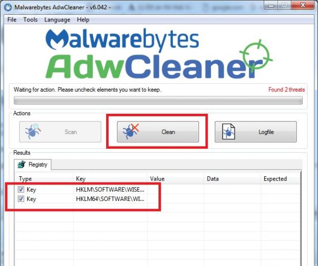 Bước 3: Sau khi quét xong bạn nhấn vào Clean để dọn dẹp mã độc được AdwCleaner liệt kê ra.