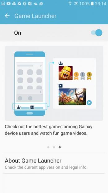 Ngoài ra S7 còn được bổ sung Game Launcher với khả năng tuỳ chỉnh cấu hình như tăng giảm độ phân giải hoặc tốc độ khung hình, sử dụng khi chơi game, giúp người dùng đạt được trải nghiệm tốt nhất hoặc tiết kiệm pin nhất.