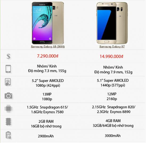 Với chênh lệch giá tiền khá lớn, dĩ nhiên S7 là chiếc điện thoại thuộc hàng đáng sở hữu nhất của Samsung. Tuy nhiên với mức tiền eo hẹp hơn, Galaxy A5 cũng không làm bạn cảm thấy thua thiệt.