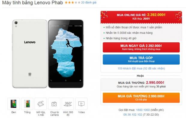 Theo đó, mẫu tablet giá rẻ Lenovo Phab hiện đang được giảm giá trong chương trình mua online giá rẻ, cụ thể là mức giá sẽ được hạ từ 2.99 triệu xuống còn 2.39 triệu, giảm 600 ngàn đồng. Lưu ý chương trình này chỉ áp dụng đến ngày 20/1 thôi nhé.