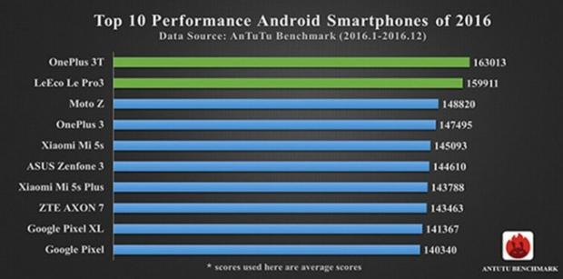 2 smartphone đầu bảng của Apple chiếm vị trí thứ nhất và thứ hai với điểm số benchmark cao nhất trong bảng xếp hạng của AnTuTu, tiếp đó là OnePlus 3T. Không có sự xuất hiện bất kì thiết bị Samsung nào trong top 10 smartphone có hiệu suất cao nhất năm qua.