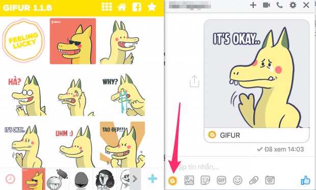 Bước 3: Khởi động Facebook, tại cửa sổ chat bạn nhấn vào biểu tượng 'G' sau đó chọn các icon yêu thích và chia sẻ với bạn bè.