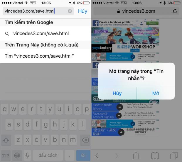Tuy nhiên nếu đã trót nhận được tin nhắn này, để khắc phục tạm thời tình trạng iMessage bị đơ, bạn có thể truy cập vào địa chỉ https://www.vincedes3.com/save.html từ trình duyệt Safari. Sau đó nhấn Mở để duyệt tin nhắn.