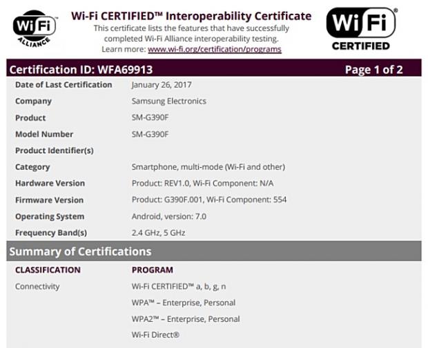 Theo đó trang tin gsmarena đã cho hay thiết bị khởi chạy hệ điều hành Android 7.0 từ Samsung có tên mã SM-G390F đã nhận chứng nhận WiFi từ tổ chức WiFi Alliance.