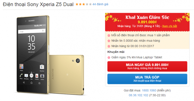 Nhân dịp Tết này, Z5 Dual đang được giảm giá rất tốt chỉ còn 9.9 triệu đồng, giảm ngay 1 triệu đồng so với giá niêm yết. Do đang trong thời gian nghỉ Tết nên bạn có thể đặt hàng ngay hôm nay và nhận sản phẩm sau 8h ngày 31/1 nhé.
