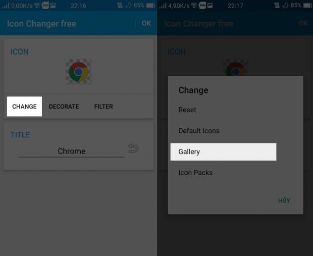 Tại đây, bạn chọn vào mục Change > Gallery để đổi biểu tượng theo những hình hình ảnh có sẵn trong máy.