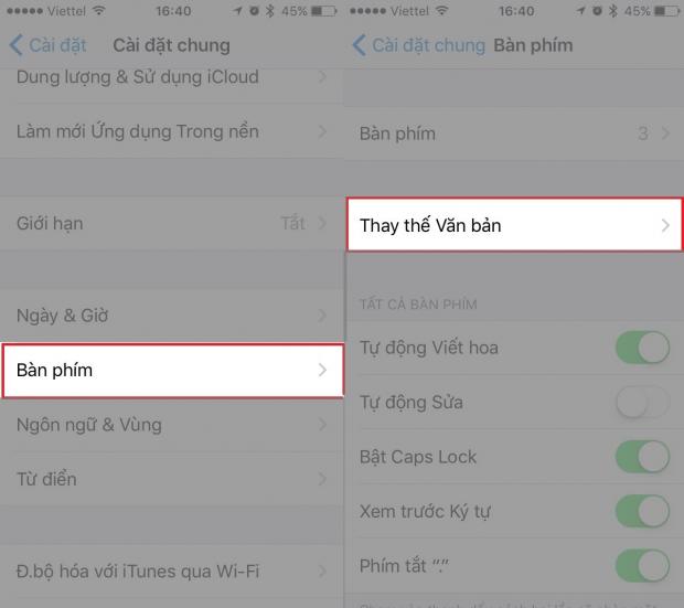 Để tạo cụm từ gõ tắt, vào Cài đặt > Cài đặt chung > Bàn phím > Thay thế văn bản.