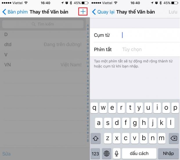 Tại giao diện chính của Thay thế văn bản, nhấp vào dấu + phía trên bên phải và làm theo hướng dẫn để thêm từ.