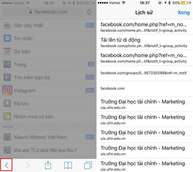 Để xem lịch sử duyệt Web trên Safari cũng khá đơn giản, bạn chỉ cần nhấn và giữ phím Quay lại ở góc trái màn hình, ngay lập tức một trình quản lý lịch sử duyệt Web sẽ xuất hiện để bạn thao tác theo nhu cầu.