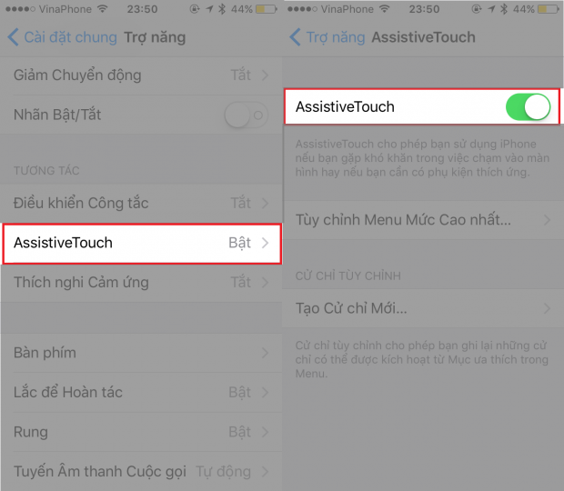 Chọn vào mục Assistive Touch và Kích hoạt nó lên.