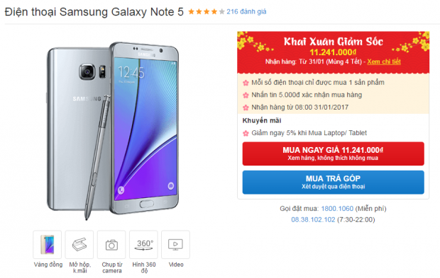 Ngoài ra, có một lưu ý là vì đang trong thời gian nghỉ Tết, nên bạn có thể đặt hàng ngay với mức giá ưu đãi và nhận sản phẩm từ ngày 31/1 đến hết ngày 6/2. Đây sẽ là ưu đãi rất hấp dẫn dành cho mẫu phablet cao cấp nhất hiện tại của Samsung.