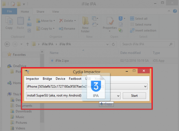 Sau khi iPhone đã kết nối thành công, hãy kéo têp tin .ipa vừa tải về vào giao diện của Cydia Impactor.