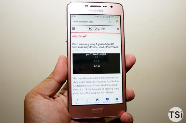 Samsung Galaxy J2 Prime sở hữu màn hình Super AMOLED 5 inch qHD (540 x 960 pixles), màn hình này qua trải nghiệm, Techsign.in thấy có độ sáng cao, hoàn toàn giúp bạn có thể đọc được nội dung dù dưới trời nắng gắt. Phiên bản J2 Prime mà Techsign.in có dịp trải nghiệm có vỏ lưng màu vàng hồng bằng nhựa cứng, được phủ họa tiết đan chéo lồi lõm dạng vảy cá, giúp cầm chắc nhưng không bám dấu vân tay.