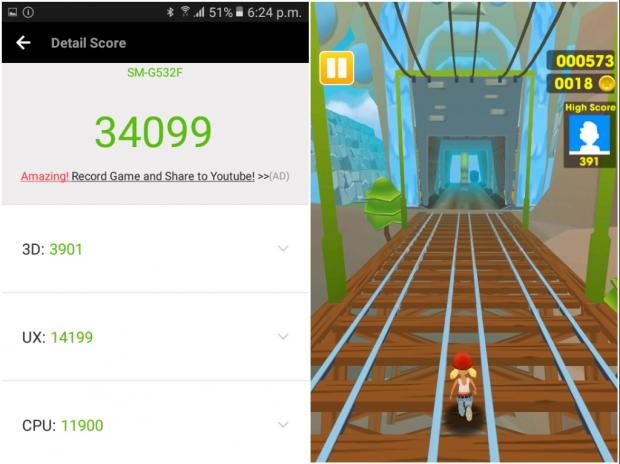 Cụ thể, khi thử nghiệm bằng ứng dụng AnTuTu BenchMark, máy cho điểm đạt 34.099 điểm, thử nghiệm chơi tựa game Subway Rush 2, máy cho khả năng phản hồi tốt, quá trình chơi không gặp hiện tượng lag hay chậm. Dù vậy việc dung lượng bộ nhớ RAM hạn chế lại thấy khá rõ ở việc chuyển sang ứng dụng khác, tuy vậy vẫn ở mức dễ chấp nhận.