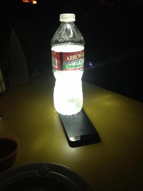 Bạn có thể tự chế một chiếc đèn phòng khi đi cắm trại hoặc khi cúp điện đột ngột chỉ bằng đèn flash iPhone và một chai nước. Trước hết, bật đèn flash rồi hướng ánh đèn lên trên rồi đặt một chai nước lên nó. Nước sẽ phát tán ánh sáng để soi sáng không gian rộng hơn. Bạn có thể dùng chai nước có màu khác nhau để tạo hiệu ứng khác nhau.