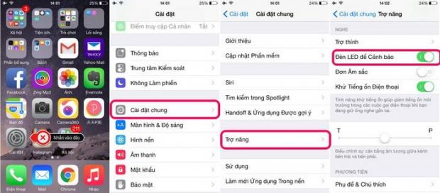iPhone tích hợp sẵn chức năng bật flash thông báo cuộc gọi và tin nhắn, tránh bỏ lỡ những cuộc gọi quan trọng. Để sử dụng chức năng này, bạn vào Cài đặt/Setting > Cài đặt chung/General > Trợ năng/Accessibility > Nghe/Hearing > bạn sẽ thấy tùy chọn bật đèn LED cho Alert. Khi chọn tính năng này, mỗi khi có tin nhắn hay cuộc gọi, đèn flash sẽ nháy một lần.