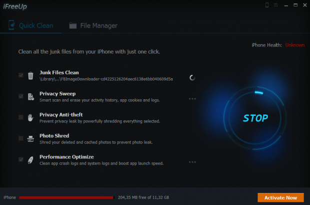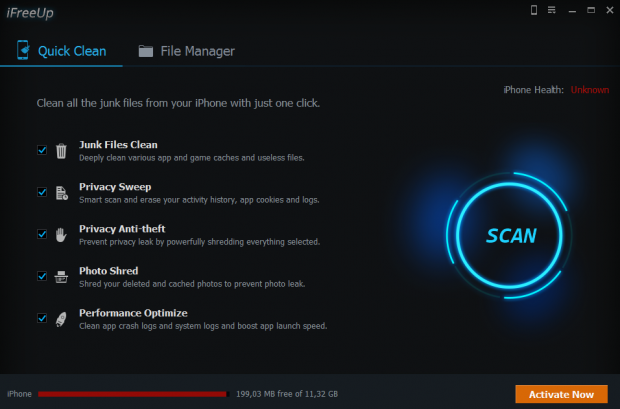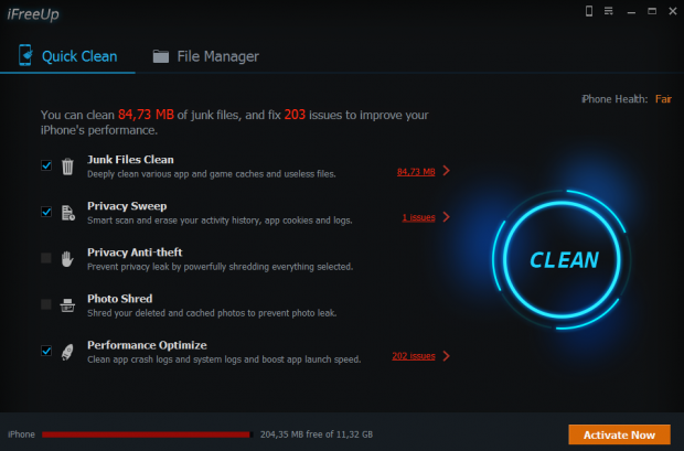 Giao diện của iFreeUp khá trực quan, người dùng có thể dễ dàng thao tác. Bạn sẽ có 2 tùy chọn chính là Quick Clean và File Manager, 2 tùy chọn đảm nhiệm 2 nhiệm vụ khác nhau.