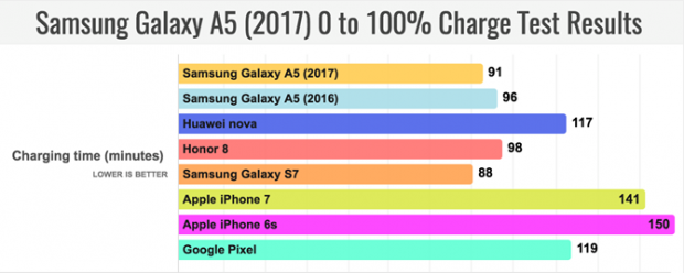 Chưa dừng lại ở đó, Samsung còn tích hợp tính năng sạc nhanh rất hiệu quả cho smartphone này. Galaxy A5 2017 chỉ mất 1 giờ 31 phút để sạc đầy viên pin 3.000mAh, đây là tốc độ sạc gần như tốt nhất hiện nay, chỉ lâu hơn 3 phút so với Galaxy S7 và nhanh hơn nhóm còn lại, kể cả Google Pixel hay iPhone 7.