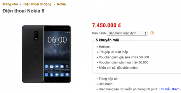 Chỉ 2 ngày sau khi xuất hiện tại Việt Nam với giá 9 triệu, một số cửa hàng đã chào bán Nokia 6 xách tay với giá mới là 7,45 triệu.