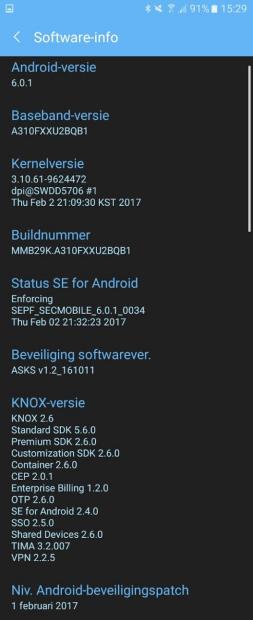 Bản cập nhật mới có mã số là A310FXXU2BQB1 khi được tung ra ở Hà Lan, nó có dung lượng 226MB và sẽ khắc phục 50 lỗ hổng trên hệ điều hành Android cũng như điều chỉnh một số phần mềm Samsung trên máy. Tính ổn định và hiệu suất cũng sẽ được cải thiện trên bản cập nhật này.