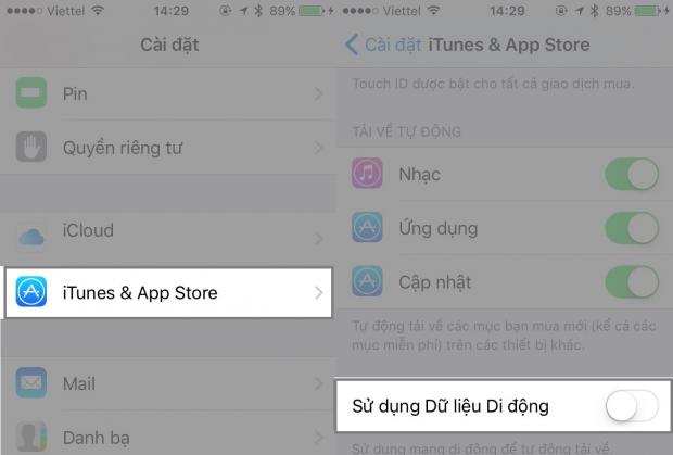 Điều này quả thật vô cùng bất lợi, nếu iPhone của bạn hiện đang không được kết nối với Wi-Fi. Mạng di động sẽ bị hao tốn vô cùng nhiều nếu xảy ra trường hợp này. Để vô hiệu hóa sử dụng mạng di động để tải ứng dụng, bạn cần truy cập Cài đặt > iTunes & App Store > Gạt tắt Sử dụng Dữ liệu Di động.