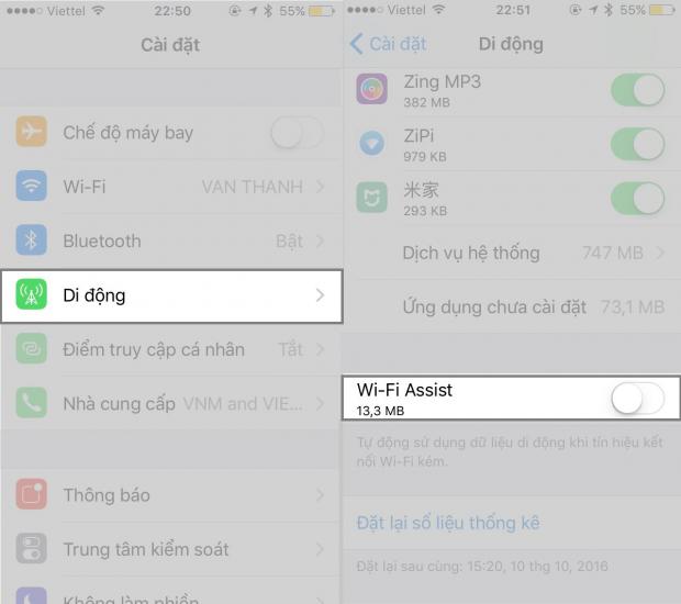 Wi-Fi Assist là một tính năng thú vị. Tính năng này sẽ tự đánh giá và kết nối bằng 3G nếu mạng Wi-Fi hiện tại không ổn định. Nhưng sẽ ảnh hưởng đến dung lượng Internet nếu bạn không chú ý. Để tắt tính năng này, bạn thực hiện các bước như sau: