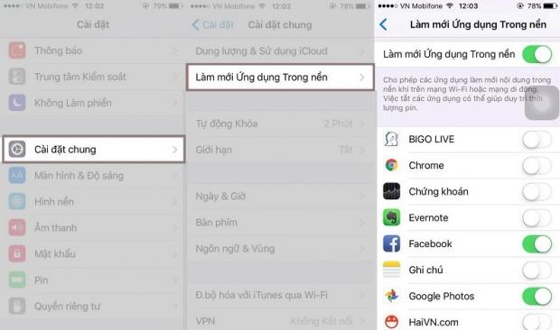 Tuy nhiên, điều này sẽ lấy đi một lượng lớn dữ liệu 3G và tuổi thọ pin của thiết bị nếu như bạn không thường xuyên mở ứng dụng. Để tắt tính năng này bạn vào: Cài đặt > Cài đặt chung > Tắt Làm mới ứng dụng nền.