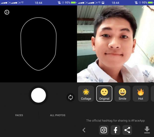 Faceapp là một ứng dụng rất thú vị khi nó sẽ phân tích khuôn mặt, sau đó thêm vào các hiệu ứng nụ cười, già, biến thành nam, nữ. Khi cài đặt xong, mọi người có thể chụp ngay hình của mình, hoặc chọn những bức hình có sẵn trong thư viện.