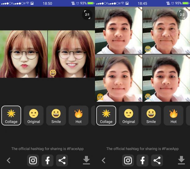 Có khá nhiều bộ lọc cho người dùng lựa chọn như thêm vào nụ cười, biến thành trẻ con, người già, thành nam hoặc nữ. Bạn còn có thể chọn 2 hoặc 4 hình cùng một lúc để tạo ra những hiệu ứng thú vị. Khi hoàn tất, mọi người có thể lưu về máy bằng cách nhấn vào dấu Tải xuống hoặc chia sẻ lên Facebook, Instagram để bạn bè cùng xem.