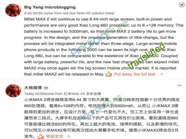 Nguồn tin này khẳng định, Mi Max 2 sẽ vẫn duy trì kích thước màn hình 6.44-inch như trên Mi Max nhưng chipset sẽ được nâng cấp lên thành Qualcomm Snapdragon 660. Phiên bản cấu hình cao của Mi Max 2 sẽ được trang bị tới 6GB RAM đi cùng lựa chọn bộ nhớ lưu trữ trong đạt 128GB. Để đảm bảo năng lượng cho các trang bị nói trên, Xiaomi sẽ sử dụng viên pin có dung lượng 5000 mAh cho Max 2 đi kèm khả năng hỗ trợ sạc nhanh.